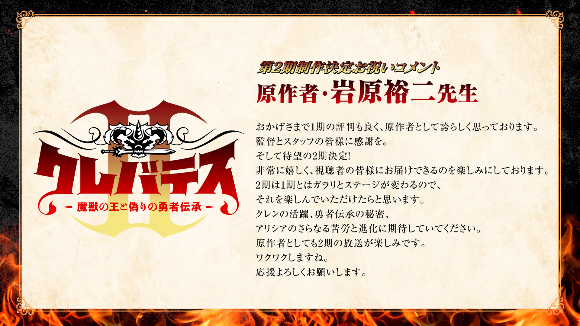 2025.09.17岩原裕二先生からの第2期制作決定お祝いコメントを公開! 原作者・岩原裕二先生より第2期制作決定お祝いコメントを頂きました! 【原作者・岩原裕二先生 お祝いコメント】 ニューストップに戻る